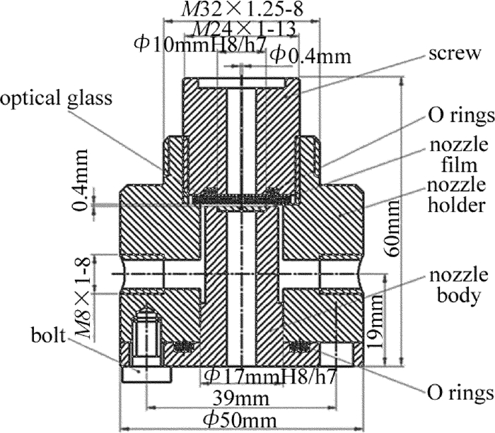 耦合裝置是實(shí)現(xiàn)激光與微水束耦合并傳輸?shù)年P(guān)鍵部件。耦合裝置主要由噴嘴體、進(jìn)水孔、O型圈、噴嘴支架等組成,如圖 2所示。本文中將噴嘴設(shè)計(jì)成圓柱形,目的是為了延長(zhǎng)微水束的破碎長(zhǎng)度。考慮到激光的能量密度比較大,且激光要在噴嘴內(nèi)部發(fā)生全反射,故噴嘴材料選用耐熱性比較好的銅。各參量具體數(shù)值為:噴嘴長(zhǎng)度為10mm,噴嘴直徑為0.4mm,耦合間隙為0.4mm。噴嘴體頂部的定位圓柱體6與噴嘴支架4通過(guò)螺紋連接,高壓水從左右兩側(cè)的注水口注入耦合裝置,并進(jìn)入噴嘴體與光學(xué)玻璃之間形成的耦合間隙,然后通過(guò)噴嘴片上的噴嘴將耦合之后的光液高能束噴射出來(lái)。圖 3為耦合裝置的實(shí)物照片。