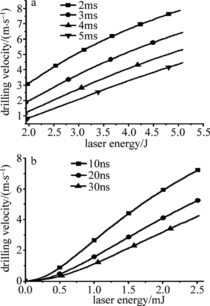 在單獨采用長脈沖打孔,考慮蒸發反沖壓強濺射熔融物質為主的模型中,長脈沖激光能量加熱材料形成熔池,同時產生蒸發反沖壓強排出液體,脈寬5ms的激光單脈沖能量需大于1.58J,根據(1)式~(7)式,得到不同脈寬作用下,打孔速率與脈沖能量的關系,如圖 7a所示。