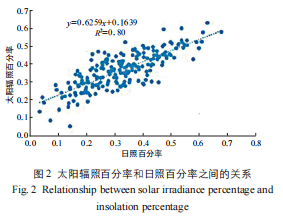 根據(jù)本光伏電站所在地附近的4 個(gè)氣象站( 興仁站、水城站、威寧站、紫云站) 在2011 年1 月至2016 年2 月期間觀測(cè)得到的各月太陽(yáng)輻照量數(shù)據(jù)與日照時(shí)數(shù)數(shù)據(jù),分別計(jì)算得到各月的太陽(yáng)輻照百分率( 即Q/Q0) 和日照百分率,為分析這二者之間的關(guān)系,將相應(yīng)數(shù)據(jù)繪制到坐標(biāo)系中,具體如圖2 所示。