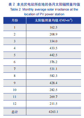從表 2 可以看出:本光伏電站所在地的全年總太陽(yáng)輻照量為4263.1MJ/平方米 。